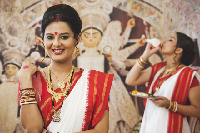 ১. পূজার সাজে এখনো গরদের আবেদন আছে। শাড়ি পরার ঢংটা পুরোনো কিন্তু সাজে নতুনের ছোঁয়া। হাতের বালাটা সোনালি রঙা, এতে থাকছে কুন্দন আর পাথরের নকশা। এর সঙ্গে একটু পনি টেলে উঁচু করে বাঁধা চুল, স্লিভলেস ব্লাউজ আর গলায় চার লহরের চেইনে পরিপূর্ণ পূজার সাজ।