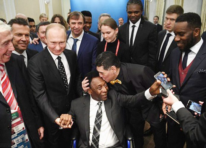 দুই কিংবদন্তির ঘনিষ্ট মুহূর্তের ছবি তুলতে হাজির আলোকচিত্রীরা। তখনই ম্যারাডোনা চুমু খেলেন পেলেকে। সাক্ষী হয়ে রইলেন পুতিন থেকে শুরু করে ফিফার কর্মকর্তারা।