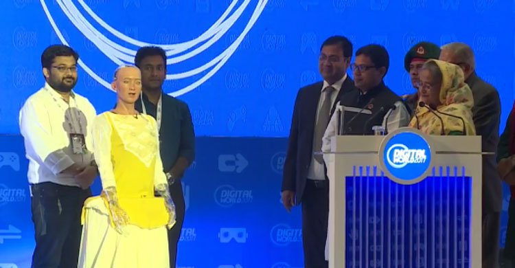 তথ্যপ্রযুক্তি খাতে বাংলাদেশের সবচেয়ে বড় প্রদর্শনী ডিজিটাল ওয়ার্ল্ডের মঞ্চে আজ বুধবার প্রধানমন্ত্রীর সঙ্গে দেখা হলো বিশ্বের প্রথম নাগরিকত্ব পাওয়া রোবট সোফিয়ার।