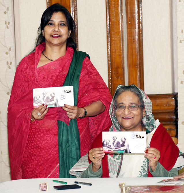 প্রধানমন্ত্রী শেখ হাসিনা বিজয় দিবস উপলক্ষে আজ শনিবার স্মারক ডাকটিকিট ও উদ্বোধনী খাম অবমুক্ত করেন। ছবি: বাসস
