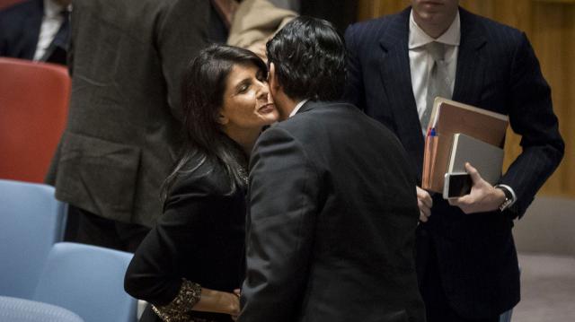 ওয়াশিংটনের ভেটোয় মিসরের উত্থাপিত প্রস্তাব নাকচ হওয়ার পর মার্কিন স্থায়ী প্রতিনিধি নিক্কি হ্যালি ও ইসরায়েলের দূত পরস্পরকে অভিনন্দন জানান