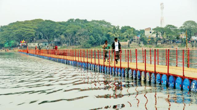 ৮০০ প্লাস্টিকের ড্রামের ওপর ভাসছে সেতু। স্থানীয়দের ভাবনা ও টাকায় নির্মাণ করা হয় সেতুটি। গতকাল যশোরের মনিরামপুরের রাজগঞ্জের ঝাঁপা বাঁওড়ে সেতুটির উদ্বোধন করা হয়