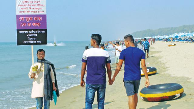 পরনে পাঞ্জাবি ও জিনসের প্যান্ট। কক্সবাজার সৈকতের লাবণী পয়েন্ট সৈকতের এক পাশে দাঁড়িয়ে টাঙ্গাইলের বাসিন্দা মো. জাহিদুল ইসলাম। হাতে প্ল্যাকার্ড, সেখানে লেখা দুর্নীতিবিরোধী নানা স্লোগান। গতকাল শুক্রবার সকাল থেকে সৈকতের নানা এলাকায় প্রচারণা চালিয়েছেন তিনি। স্থানীয় বাসিন্দা ও পর্যটকেরা প্রথমে দূর থেকে দেখলেও পরে যোগ দিয়েছেন তাঁর সঙ্গে।